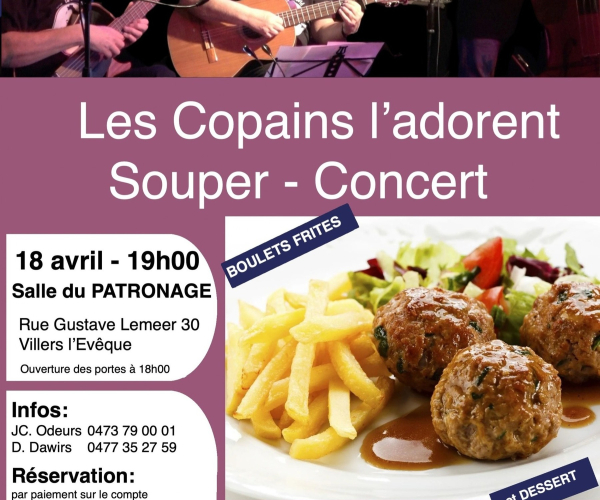 Ce 18 avril, à la salle du patronage, un souper-concert dédié à Georges Brassens: « Les copains d’abord ». Au menu, des boulets frites; Les profits des actions du groupe Tringlot.